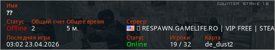 Играет на Counter Strike 1.6 сервере. Страна: СШАПервый раз замечен 03:00 23.04.2026