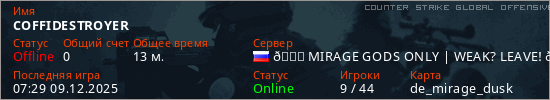 Играет на Counter Strike Global Offensive сервере. Страна: РоссияПервый раз замечен 10:48 13.06.2025