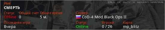 Играет на Call of Duty 4: Modern Warfare сервере. Страна: РоссияПервый раз замечен 20:49 04.12.2025