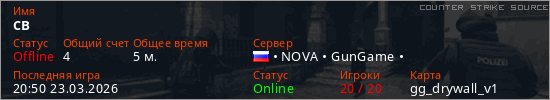 Играет на Counter Strike Source сервере. Страна: РоссияПервый раз замечен 20:48 23.03.2026