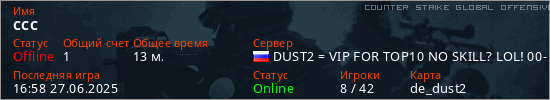 Играет на Counter Strike Global Offensive сервере. Страна: РоссияПервый раз замечен 01:21 03.01.2025