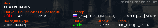 Играет на Counter Strike Source сервере. Страна: РоссияПервый раз замечен 00:15 03.05.2025