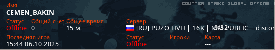 Играет на Counter Strike Global Offensive сервере. Страна: РоссияПервый раз замечен 17:15 09.04.2025