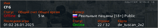 Играет на Counter Strike 1.6 сервере. Страна: РоссияПервый раз замечен 01:00 26.01.2025