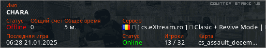 Играет на Counter Strike 1.6 сервере. Страна: РумынияПервый раз замечен 06:26 21.01.2025