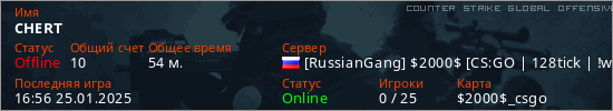 Играет на Counter Strike Global Offensive сервере. Страна: РоссияПервый раз замечен 15:31 16.01.2025