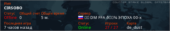 Играет на Counter Strike Global Offensive сервере. Страна: РоссияПервый раз замечен 13:39 05.03.2026
