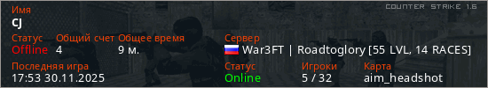 Играет на Counter Strike 1.6 сервере. Страна: РоссияПервый раз замечен 16:29 01.05.2025