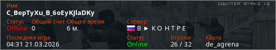 Играет на Counter Strike 1.6 сервере. Страна: РоссияПервый раз замечен 04:25 21.03.2026