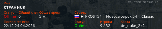 Играет на Counter Strike 1.6 сервере. Страна: РоссияПервый раз замечен 21:53 24.04.2026