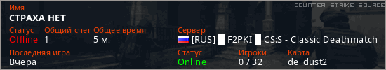 Играет на Counter Strike Source сервере. Страна: РоссияПервый раз замечен 19:34 03.12.2025
