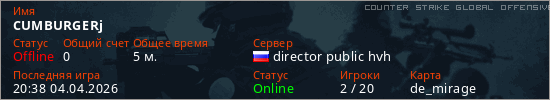 Играет на Counter Strike Global Offensive сервере. Страна: РоссияПервый раз замечен 20:21 04.04.2026