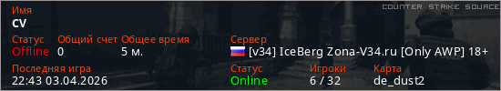 Играет на Counter Strike Source сервере. Страна: РоссияПервый раз замечен 22:37 03.04.2026
