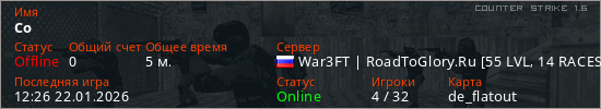 Играет на Counter Strike 1.6 сервере. Страна: РоссияПервый раз замечен 12:24 22.01.2026