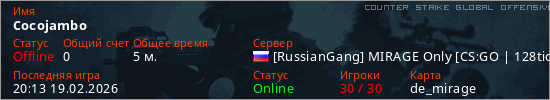 Играет на Counter Strike Global Offensive сервере. Страна: РоссияПервый раз замечен 20:09 19.02.2026