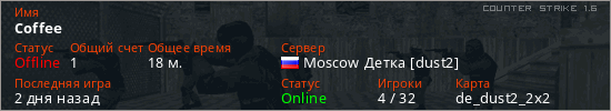 Играет на Counter Strike 1.6 сервере. Страна: РоссияПервый раз замечен 11:15 22.04.2026
