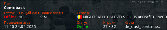 Последний раз был в сети 11:40 24.04.2025 Игрок с таким ником замечен на 6 серверах