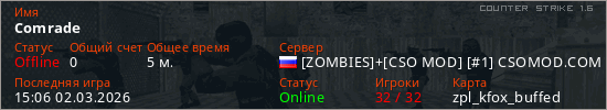 Играет на Counter Strike 1.6 сервере. Страна: РоссияПервый раз замечен 15:04 02.03.2026