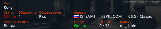 Играет на Counter Strike Source сервере. Страна: РоссияПервый раз замечен 11:13 29.03.2026