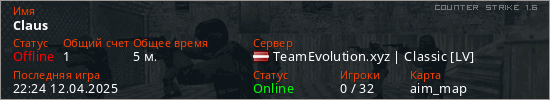 Играет на Counter Strike 1.6 сервере. Страна: ЛатвияПервый раз замечен 20:15 12.04.2025