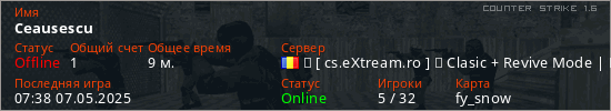 Играет на Counter Strike 1.6 сервере. Страна: РумынияПервый раз замечен 22:53 05.01.2025