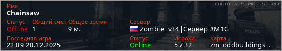 Играет на Counter Strike Source сервере. Страна: РоссияПервый раз замечен 10:15 20.12.2025
