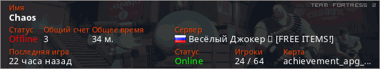 Играет на Team Fortress 2 сервере. Страна: РоссияПервый раз замечен 22:24 14.03.2026