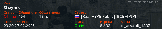 Играет на Counter Strike 1.6 сервере. Страна: РоссияПервый раз замечен 12:34 12.12.2024