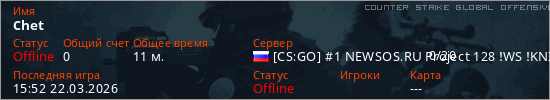Играет на Counter Strike Global Offensive сервере. Страна: РоссияПервый раз замечен 21:49 17.03.2026