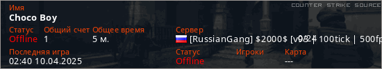 Играет на Counter Strike Source сервере. Страна: РоссияПервый раз замечен 02:38 10.04.2025