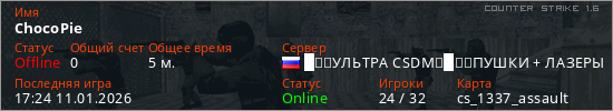 Играет на Counter Strike 1.6 сервере. Страна: РоссияПервый раз замечен 17:22 11.01.2026