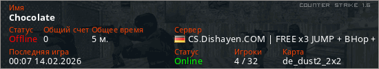 Играет на Counter Strike 1.6 сервере. Страна: ГерманияПервый раз замечен 00:03 14.02.2026