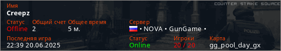 Играет на Counter Strike Source сервере. Страна: РоссияПервый раз замечен 22:37 20.06.2025
