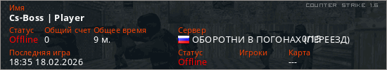 Играет на Counter Strike 1.6 сервере. Страна: РоссияПервый раз замечен 12:35 18.02.2026