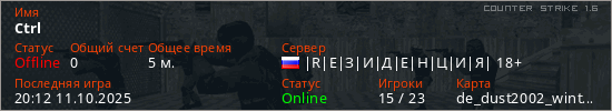 Играет на Counter Strike 1.6 сервере. Страна: РоссияПервый раз замечен 20:06 11.10.2025