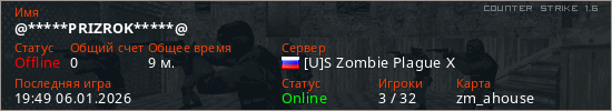 Играет на Counter Strike 1.6 сервере. Страна: РоссияПервый раз замечен 23:05 05.01.2026