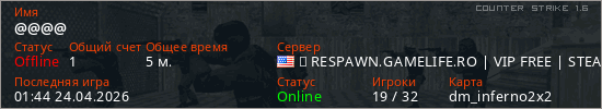 Играет на Counter Strike 1.6 сервере. Страна: СШАПервый раз замечен 01:42 24.04.2026