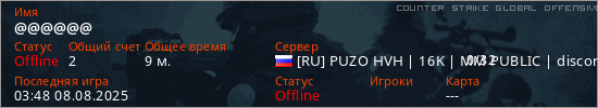 Играет на Counter Strike Global Offensive сервере. Страна: РоссияПервый раз замечен 20:11 07.08.2025