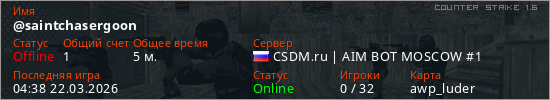 Играет на Counter Strike 1.6 сервере. Страна: РоссияПервый раз замечен 03:58 22.03.2026