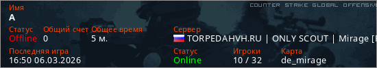 Играет на Counter Strike Global Offensive сервере. Страна: РоссияПервый раз замечен 16:45 06.03.2026