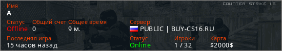 Играет на Counter Strike 1.6 сервере. Страна: РоссияПервый раз замечен 20:42 28.03.2026