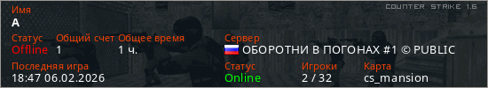 Играет на Counter Strike 1.6 сервере. Страна: РоссияПервый раз замечен 13:28 31.01.2026