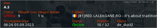 Играет на Counter Strike 1.6 сервере. Страна: РумынияПервый раз замечен 15:51 27.03.2023