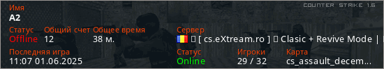 Играет на Counter Strike 1.6 сервере. Страна: РумынияПервый раз замечен 17:55 31.05.2025