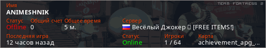 Играет на Team Fortress 2 сервере. Страна: РоссияПервый раз замечен 16:14 09.03.2026