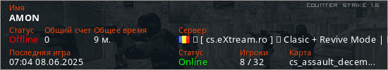Играет на Counter Strike 1.6 сервере. Страна: РумынияПервый раз замечен 07:37 19.02.2025