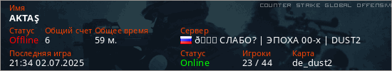 Играет на Counter Strike Global Offensive сервере. Страна: РоссияПервый раз замечен 09:44 17.05.2025
