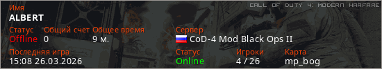 Играет на Call of Duty 4: Modern Warfare сервере. Страна: РоссияПервый раз замечен 18:42 22.03.2026