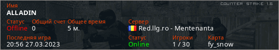 Играет на Counter Strike 1.6 сервере. Страна: РумынияПервый раз замечен 20:52 27.03.2023