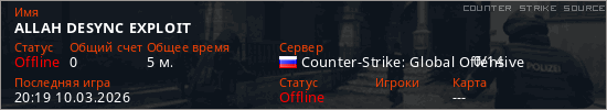 Играет на Counter Strike Source сервере. Страна: РоссияПервый раз замечен 20:13 10.03.2026